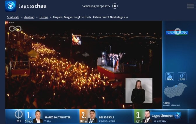 Daher wird dieser Screenshot aus dem TV Ungarns - in dem der bisherige Gegenkandidat bis zu diesem Tag, Peter Magyar, nur zehn Prozent der Sendezeit eingeräumt bekommen hatte - hier als Screenshot aus den ARD-tagesthemen gezeigt: