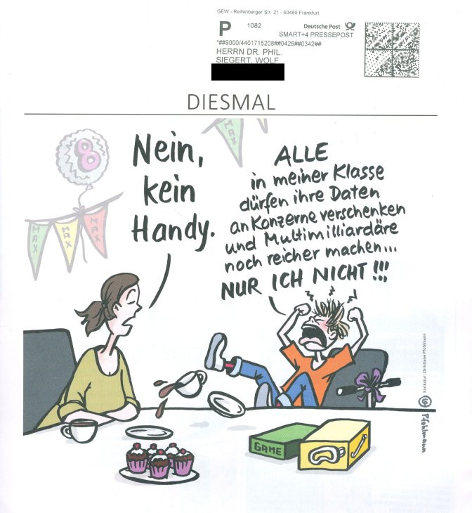 – Und für alle, denen das dann immer noch nicht reicht, bleibt nur noch, kleine Essays zu schreiben wie diesen hier, oder wissenschaftliche Bücher - oder doch lieber einen Roman [[Oder gleich ganz den Beruf wechseln? Als Quereinsteiger in die Schulen gehen? Da der Autor nicht nur Mitglied im DJV, sondern auch seit mehr als 50 Jahren in der GEW ist, hier das Cover aus der in diesen Tagen bundesweit versandten Mitgliederzeitschrift: