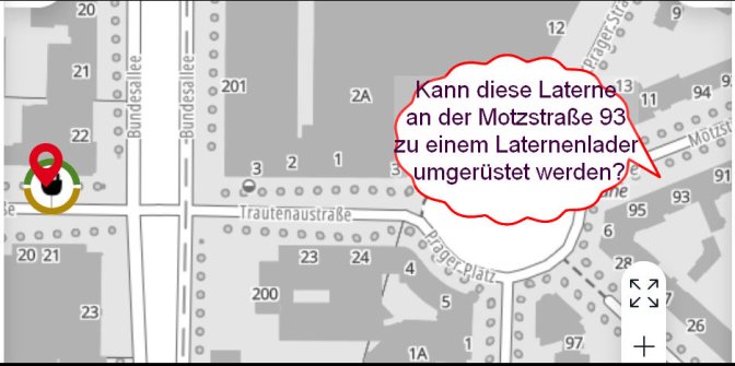 Müssen damit die Bemühungen, die Strassenlaterne an dem Behindertenparkplatz an der Motzstrasse 93 zu einem Ladepunkt zu erweitern, begraben werden?